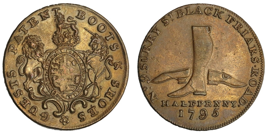 Great Britain, Middlesex, Guest's, copper Halfpenny token, 1795, Royal arms and supporters, guests patent boots & shoes, rev. boot, shoe and lady's slipper, surrey st. black friars . road. halfpenny 1795, edge payable at london + + + + + + (D&H 308), uncirculated