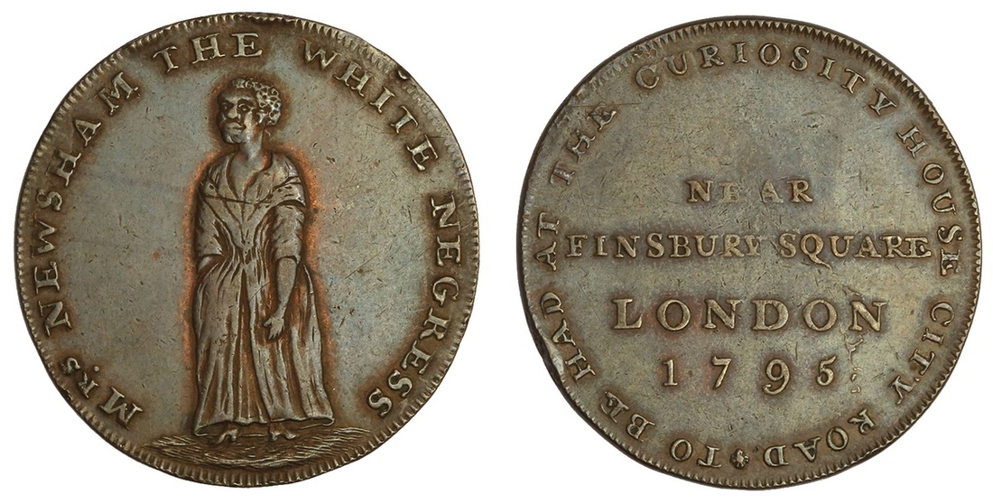 Great Britain, Middlesex, Hall's, copper Halfpenny token, 1795, woman standing, mrs. newsham the white negress, rev. to be had at the curiosity house city road near finsbury square london 1795, edge plain (D&H 317), very fine or better, rare