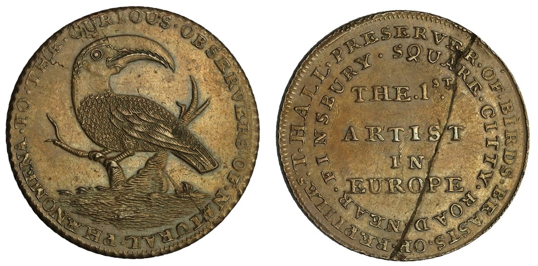 Great Britain, Middlesex, Hall's, copper Halfpenny token, 1795, toucan on branch, to. the. curious. observers. of. natural. phaenomena, rev. the 1st artist in europe, in centre, t. hall. preserver. of. birds. beasts. or. reptiles. citty. road. near. finsbury. square, edge milled (D&H 319c), uncirculated, large flan flaw across reverse