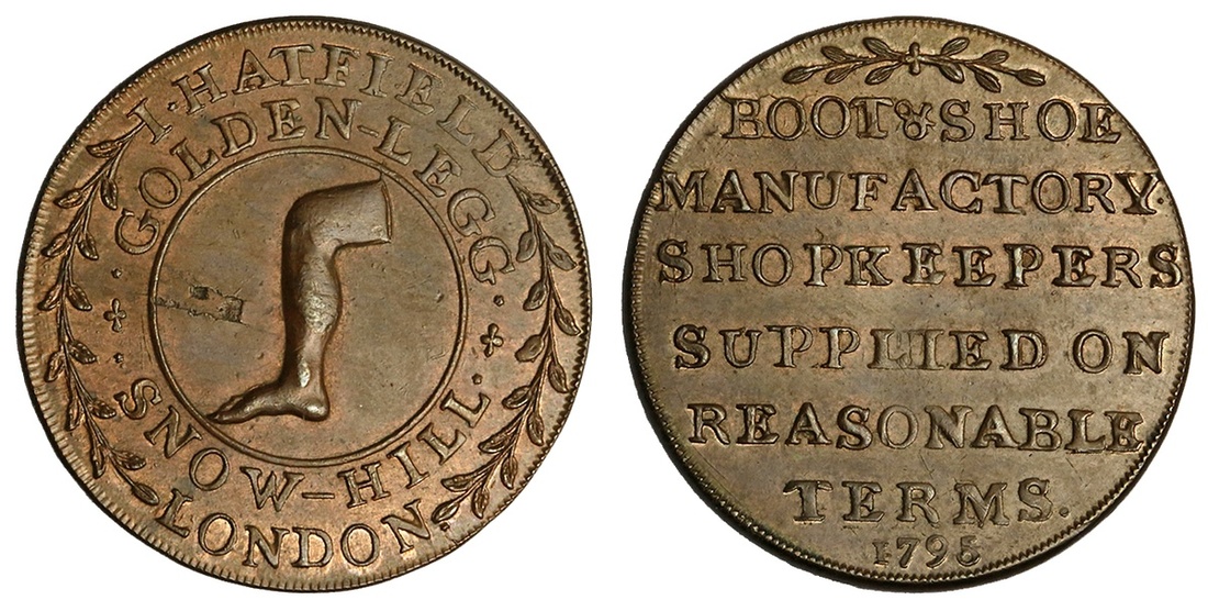 Great Britain, Middlesex, Hatfield's, copper Halfpenny token, 1795, naked leg in circle, hatfield golden-legg + snow hill + london, rev. boot & shoe manufactory shopkeepers supplied on reasonable terms 1795, edge plain (D&H 323), uncirculated
