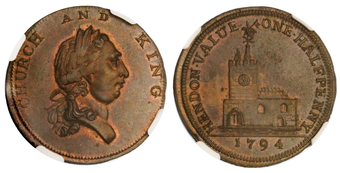 Great Britain, Middlesex, Hendon, copper Halfpenny token, 1794, view of a church, hendon. value one. halfpenny, date in exergue, rev. laureate head of George III right, church and king, edge payable in london, remainder engrailed (D&H 329), NGC MS 64 Brown, a beautiful specimen