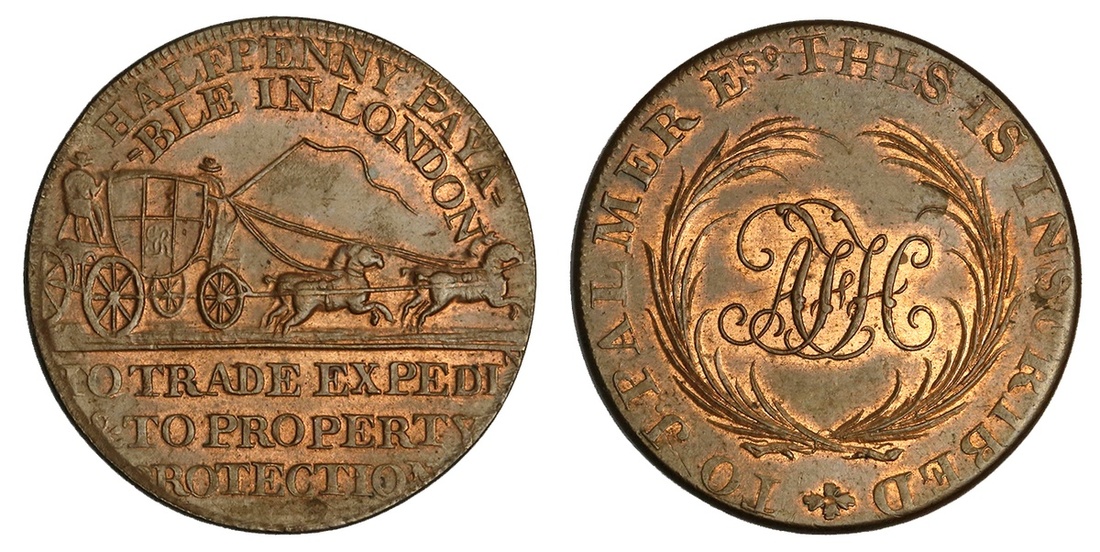 Great Britain, Middlesex, Mail Coach, copper Halfpenny token, mail coach travelling, halfpenny paya- -ble in london. to trade expedi & to property protection, rev. a f h cypher, to j. palmer esq. this is inscribed, edge plain (D&H 366), uncirculated