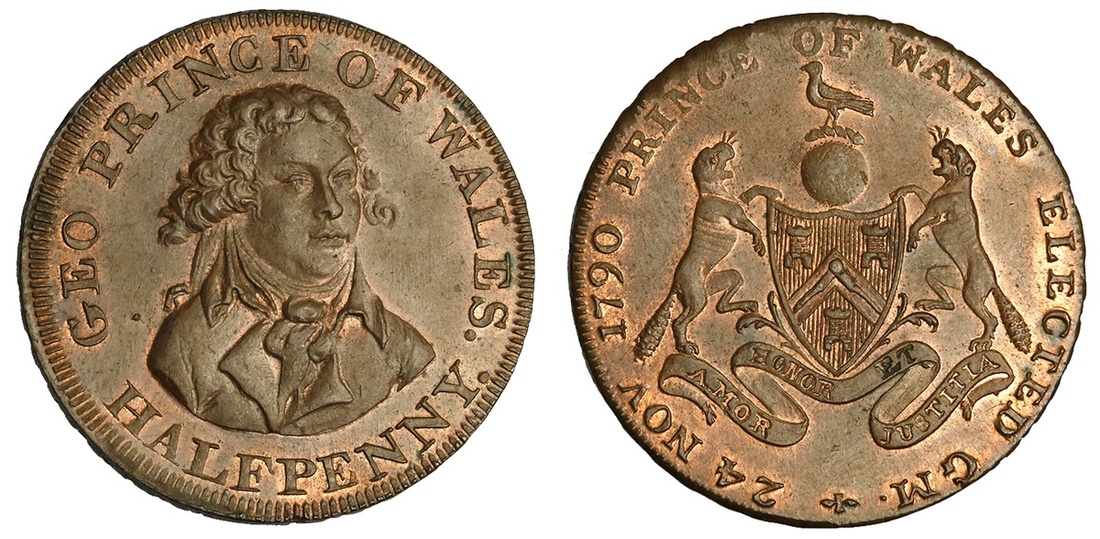 Great Britain, Middlesex, Masonic, copper Halfpenny token, 1790, Freemasons' Arms and supporters, 24 nov. 1790 prince of wales elected g m, rev. three-quarters bust right, geo prince of wales halfpenny, edge payable in lancaster london or bristol (D&H 367), uncirculated