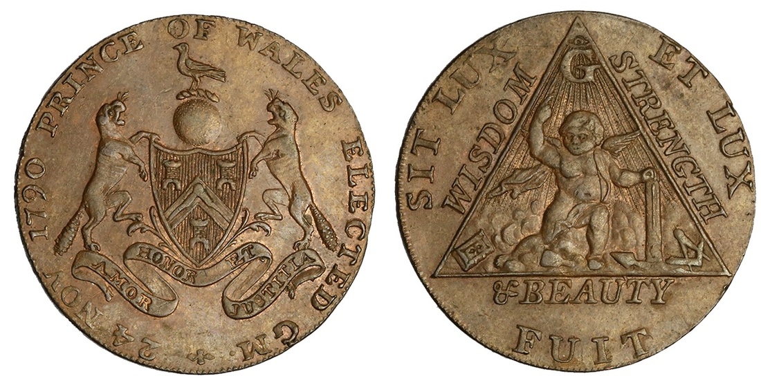 Great Britain, Middlesex, Masonic, copper Halfpenny token, 1790, Freemasons' Arms and supporters, 24 nov. 1790 prince of wales elected g m, rev. cupid and Masonic symbols in triangle, wisdom strength and beauty sit lux et lux fuit, edge masonic token i. scetchley fecit + + + (D&H 370b), good extremely fine or better