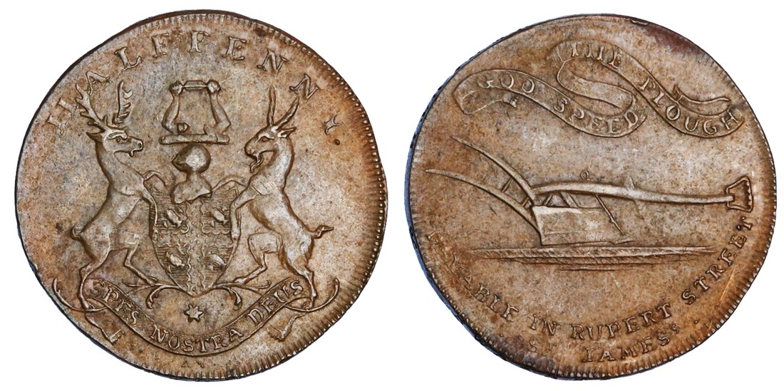 Great Britain, Middlesex, Rupert Street, copper Halfpenny token, arms and supporters of the Curriers' Company, rev. plough, god speed the plough above, payable in rupert street st. james's, edge birmingham redruth & swansea (D&H 472a), extremely fine