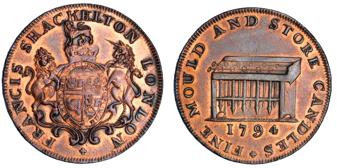 Great Britain, Middlesex, Shackelton's, copper Halfpenny token, 1794, Royal arms and supporters, francis shackelton london, rev. candle mould, fine mould and store candles, edge payable in suffolk-street haymarket x x (D&H 477), uncirculated with lustre