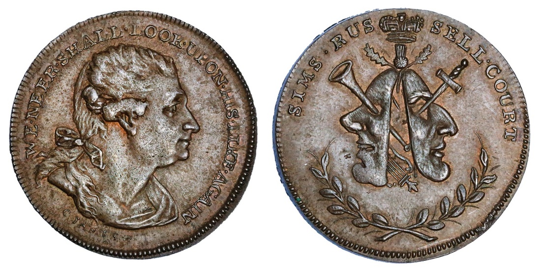 Great Britain, Middlesex, Sim's, copper Halfpenny token, bust of Garrick right, we. ne'er. shall. look. upon. his. like. again., rev. tragic and comic masks, sims. russell. court., edge plain (D&H 478a), extremely fine