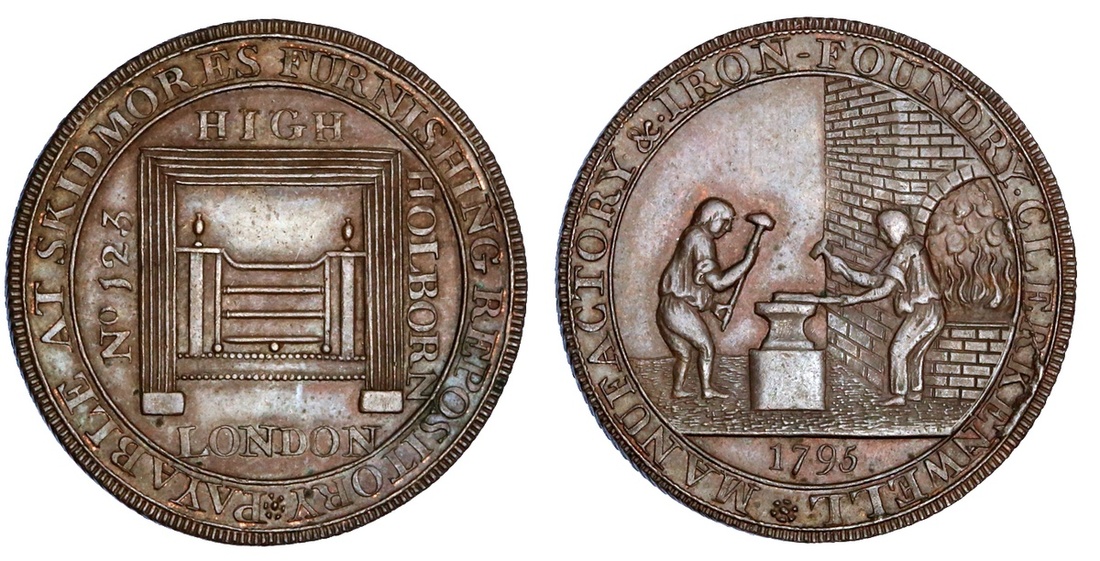 Great Britain, Skidmore's, copper Halfpenny token, 1795, register stove, no 123 high holborn london payable at skidmores furnishing repository, rev. two men at a forge, manufactory & iron-foundry clerkenwell, date in exergue, edge milled (D&H 480), extremely fine
