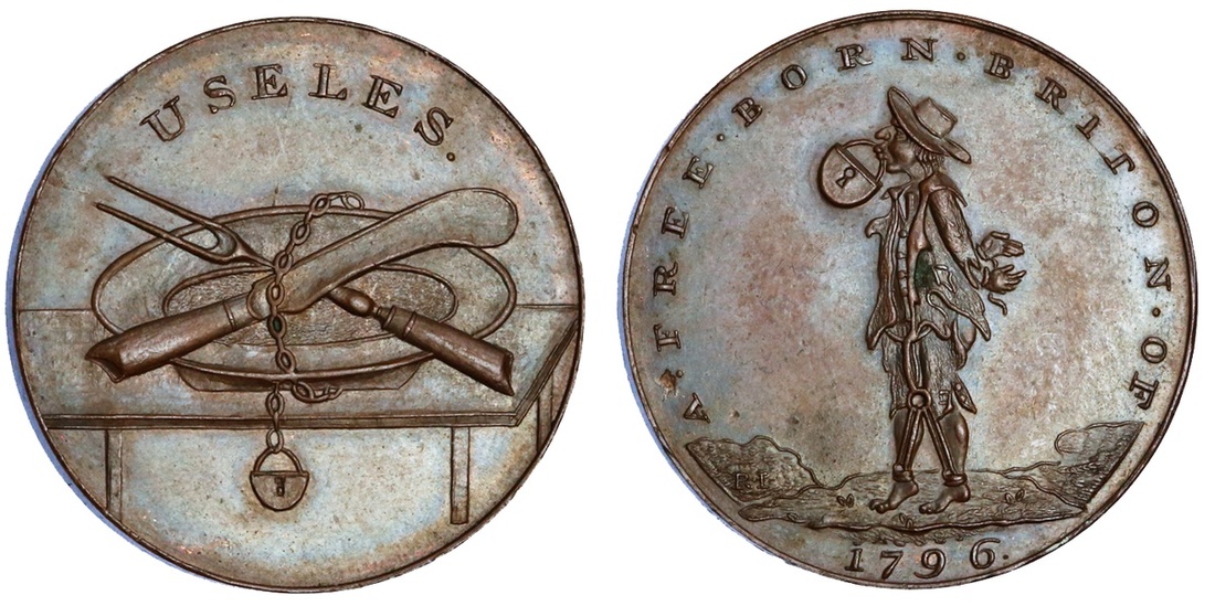Great Britain, Skidmore's, copper Halfpenny token, 1796, handcuffed man with padlock at mouth, a. free. born. briton. of. 1796, rev. knife, fork and plate chained to table, useles, edge plain (D&H 520), about uncirculated, some mild verdigris on obverse