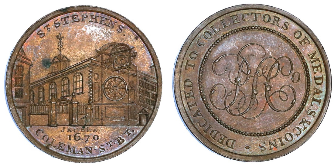 Great Britain, Middlesex, Skidmore's, copper Halfpenny token, view of church, st stephens, jacobs / 1760 coleman st bt below, rev. ornate monogram, dedicated to collectors of medals & coins, edge plain (D&H 570), uncirculated, small dark spot to reverse