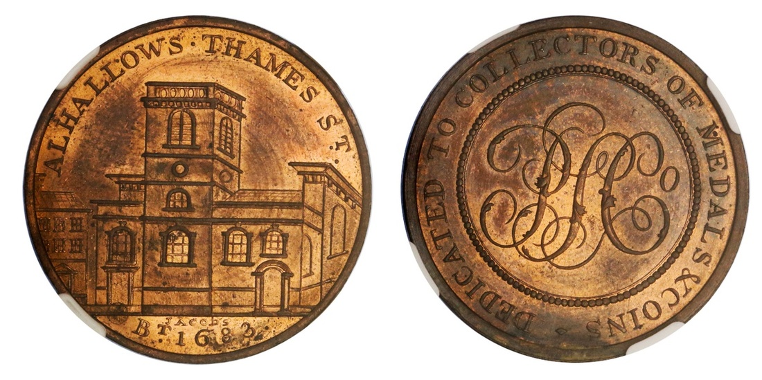 Great Britain, Middlesex, Skidmore's, copper Halfpenny token, view of church, alhallows. thames st., jacobs / bt 1683 below, rev. ornate monogram, dedicated to collectors of medals & coins, edge plain (D&H 633), NGC MS 64 Red Brown