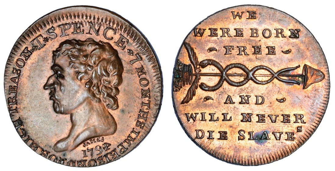 Great Britain, Middlesex, Spence's, copper Halfpenny token, bust left, t. * spence . 7 months imprison'd for high treason ., 1794 with retrograde 4 below, rev. caduceus between crown and cap, we were born -free- -and- will never die slaves, edge spence x dealer x in x coins x london x (D&H 679), uncirculated with lustre, some dark spots to reverse