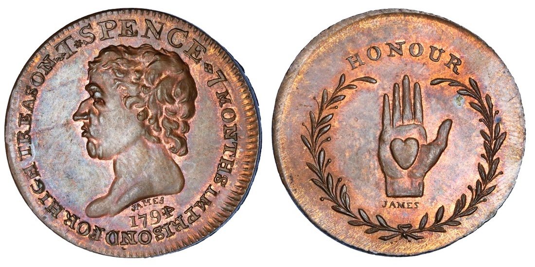 Great Britain, Middlesex, Spence's, copper Halfpenny token, bust left, t. * spence . 7 months imprison'd for high treason ., 1794 with retrograde 4 below, rev. heart in hand within wreath, honour above, james below, edge plain (D&H 682c), uncirculated with some lustre