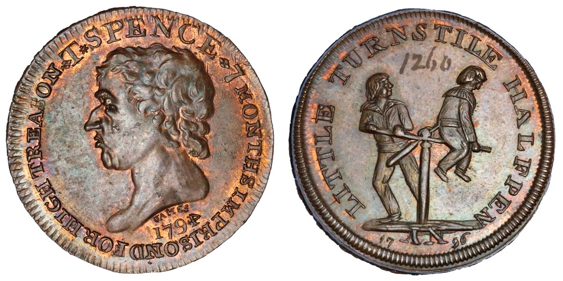 Great Britain, Middlesex, Spence's, copper Halfpenny token, 1796, bust left, t. * spence . 7 months imprison'd for high treason ., 1794 with retrograde 4 below, rev. boys on turnstile, little turnstile halfpenny, date 1796 below, edge plain (D&H 693), uncirculated with lustre, old 'museum number' 1260 inked on reverse