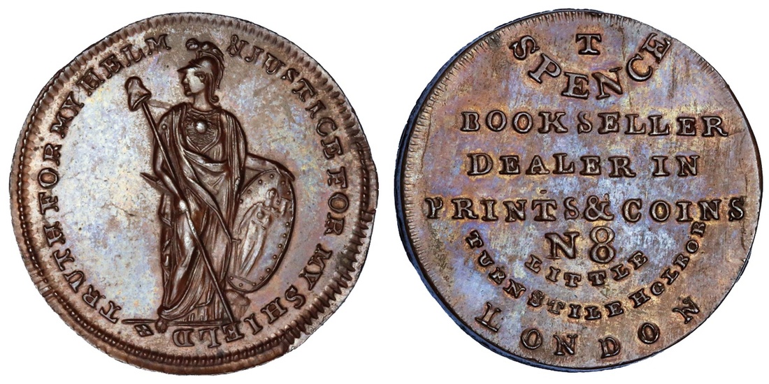 Great Britain, Middlesex, Spence's, copper Halfpenny token, t. spence bookseller dealer in prints & coins n 8 little turnstile holbob london, rev. Minerva standing, truth for my helm & justice for my shield, edge plain (D&H 699), uncirculated, pleasant colour