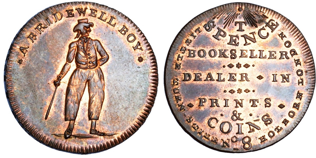 Great Britain, Middlesex, Spence's, copper Halfpenny token, beneath a radiation t spence bookseller dealer in prints. &. coins. little turn-stile no 8 holborn london., rev. youth with stick, *a bridewell boy*, edge spence dealer x in x coins x london x (D&H 708), uncirculated with lustre