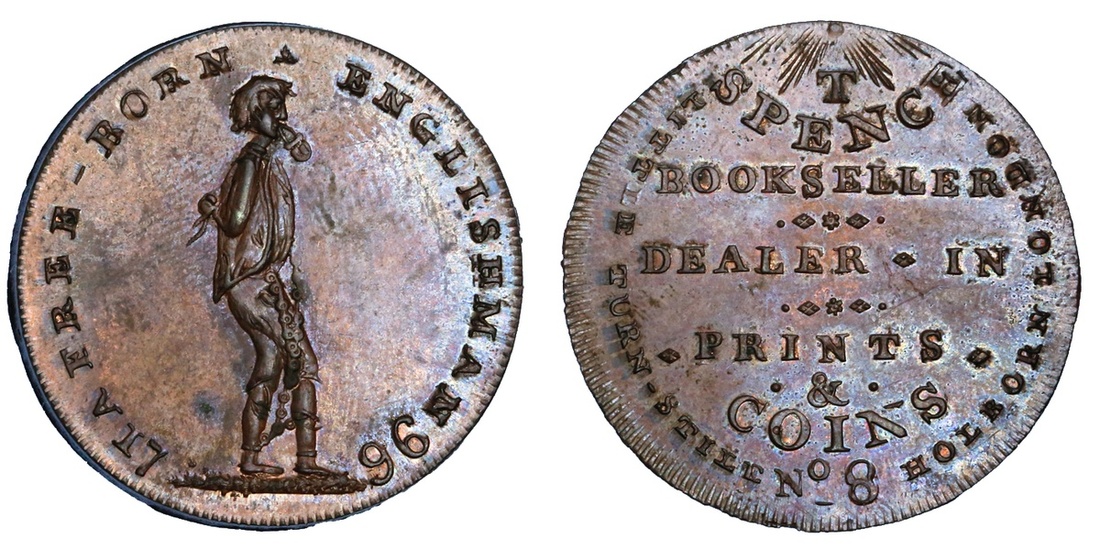 Great Britain, Middlesex, Spence's, copper Halfpenny token, 1796, beneath a radiation t spence bookseller dealer in prints. &. coins. little turn-stile no 8 holborn london., rev. fettered man with padlock at mouth, a free-born englishman 1796, edge plain (D&H 709), uncirculated and proof-like