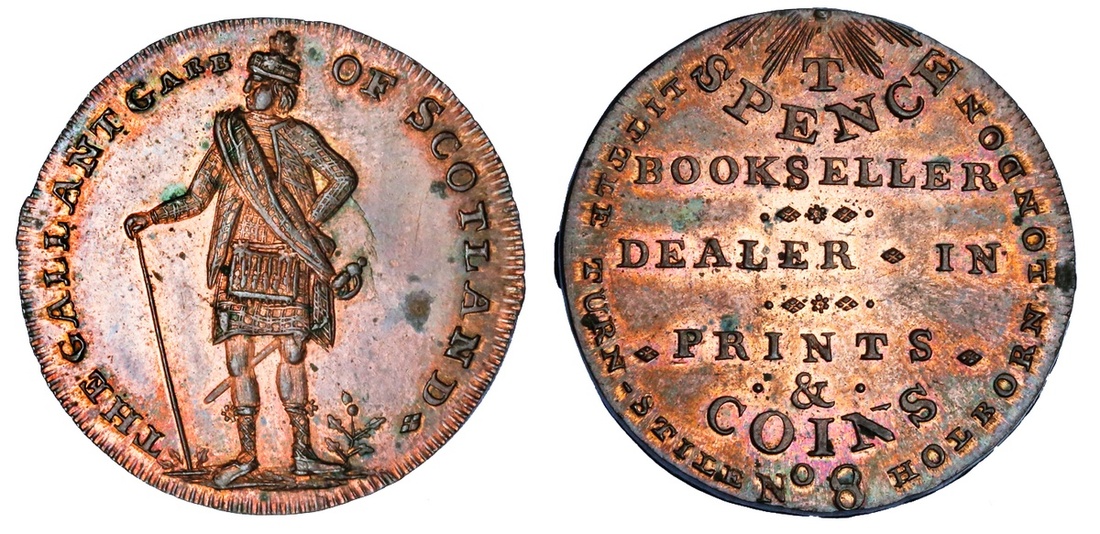 Great Britain, Middlesex, Spence's, copper Halfpenny token, t spence bookseller dealer in prints. &. coins. little turn-stile no 8 holborn london., rev. Highlander, the gallant garb of scotland, edge plain (D&H 710), uncirculated with lustre, some light verdegris spots