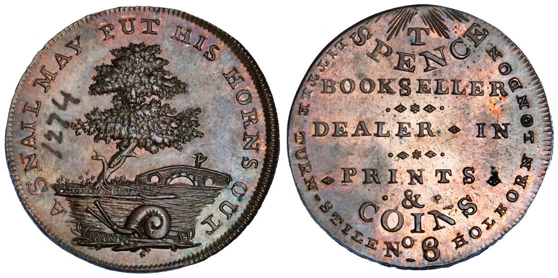 Great Britain, Middlesex, Spence's, copper Halfpenny token, t spence bookseller dealer in prints. &. coins. little turn-stile no 8 holborn london., rev. snail under tree, a snail may put his horns out, edge plain (D&H 714b), uncirculated, 'museum number' 1274 on reverse