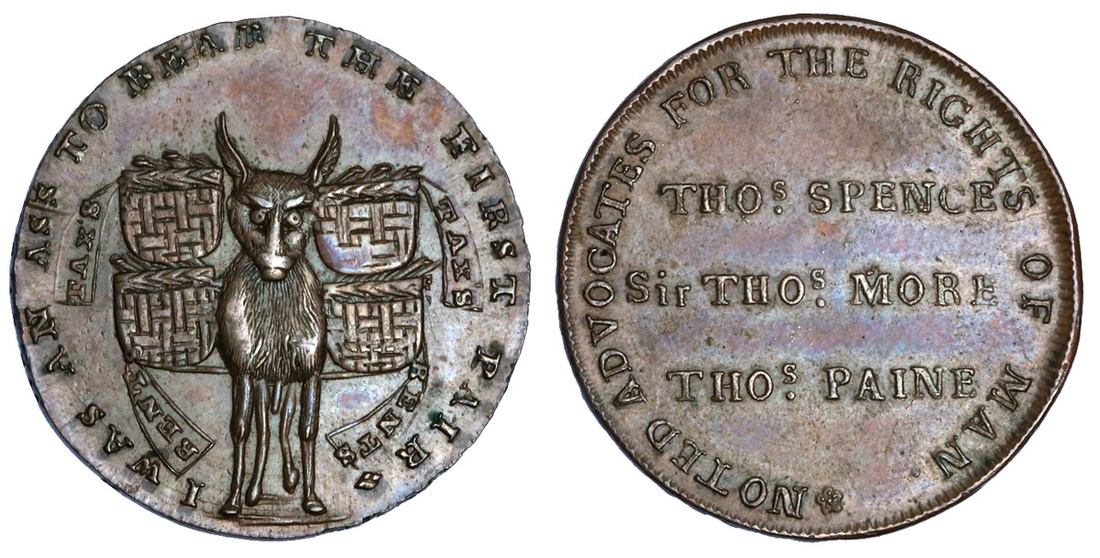 Great Britain, Middlesex, Spence's, copper Halfpenny token, ass bearing two pairs of paniers labelled rents and tax's, i was an ass to bear the first pair, rev. thos spence sir thos more thos paine * noted advocates for the rights of man, edge spence x dealer x in x coins x london x (D&H 716), good extremely fine, rare