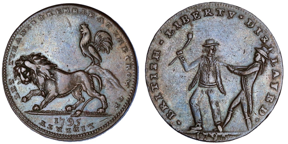 Great Britain, Middlesex, Spence's, copper Halfpenny token, 1795, sailor seizing a landsman, * british * liberty * displayed *, date in exergue, rev. lion dismayed at cock crowing, let tyrants tremble at the crow of liberty, edge plain (D&H 733), good extremely fine