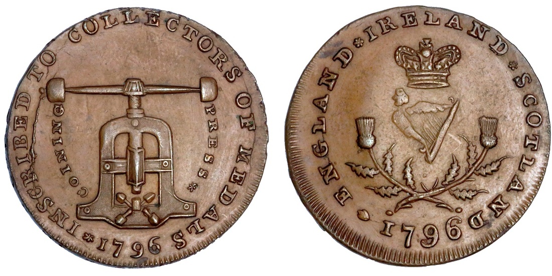 Great Britain, Middlesex, Spence's, copper Halfpenny token, 1796, coining press, inscribed to collectors of medals, rev. crowned harp between two thistles, england. ireland. scotland, edge spence x dealer x in x coins x london x (D&H 741), uncirculated