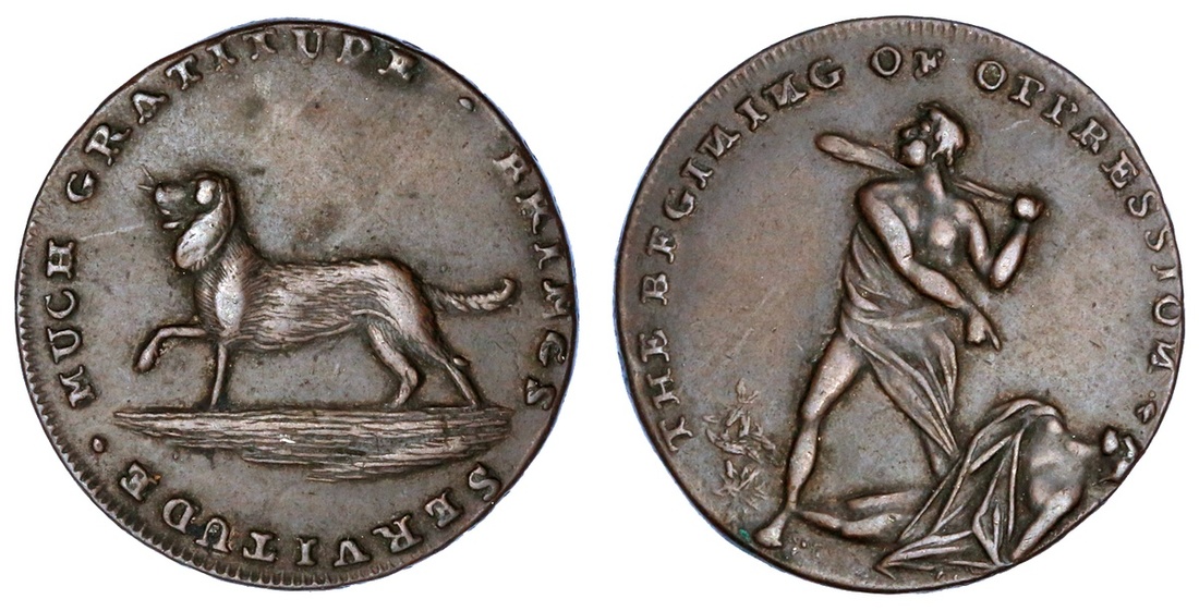 Great Britain, Middlesex, Spence's, copper Halfpenny token, dog, much gratitude brings servitude, rev. Cain killing Abel, the beginning of oppression, all n's inverted, edge spence dealer x in x coins x london x (D&H 754), extremely fine and very rare