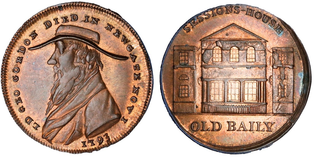 Great Britain, Middlesex, Spence's, copper Halfpenny token, 1793, bust left, ld geo gordon died in newgate nov i 1793, rev. view of public building, sessions-house old baily, edge plain (D&H 780a), crisp uncirculated with lustre, some discoloured spots to reverse