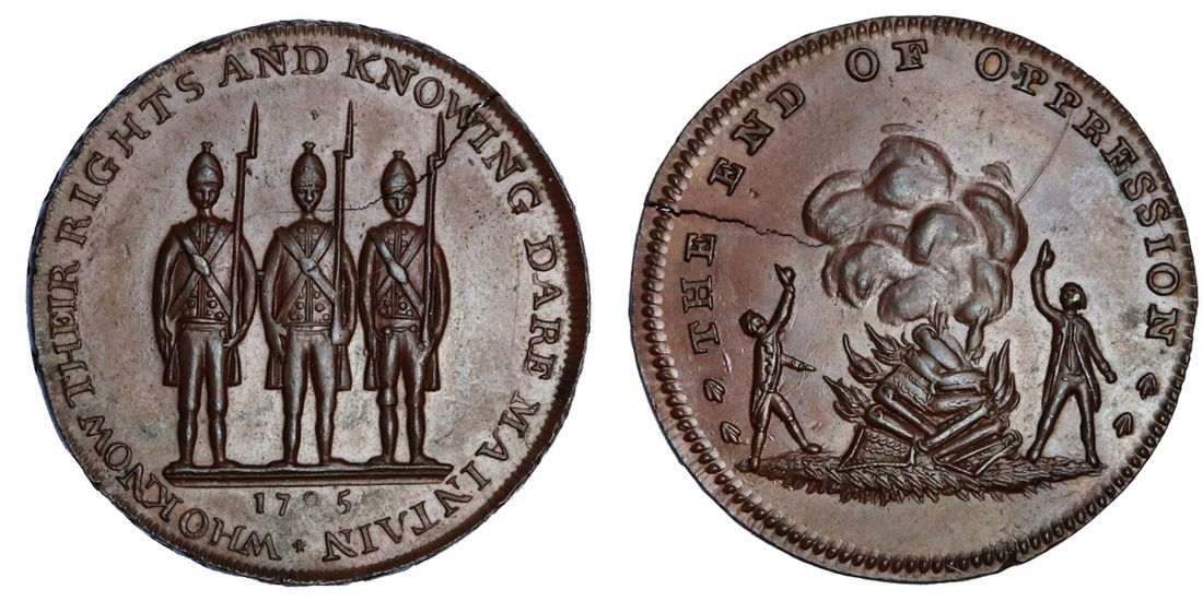 Great Britain, Middlesex, Spence's, copper Halfpenny token, 1795, two men dancing around a fire, the end of oppression, rev. armed citizens, who know their rights and knowing dare maintain, edge milled (D&H 821), uncirculated, flan crack at 10 o'clock, rare