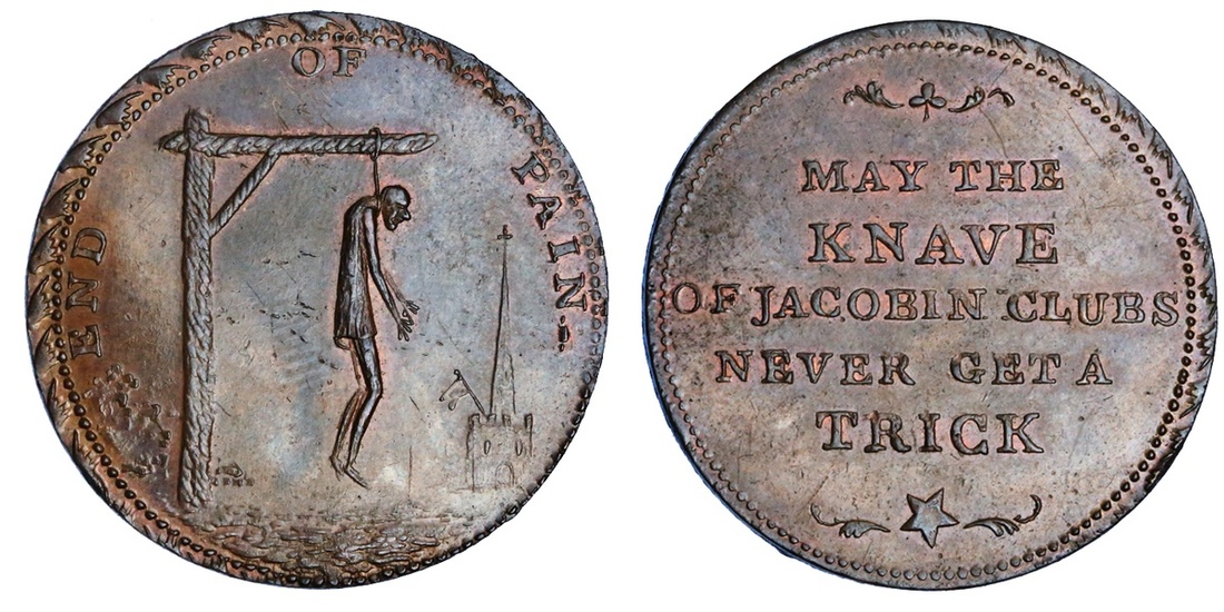 Great Britain, Middlesex, Spence's, copper Halfpenny token, 1790s, a man hanging from a gibbet, church behind, end of pain, rev. may the knave of jacobin clubs never get a trick, edge plain (D&H 830a), uncirculated and rare