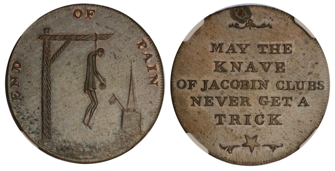 Great Britain, Middlesex, Spence's, copper Halfpenny token, man hanging on a gibbet, church behind, end of pain, rev. may the knave of jacobin clubs never get a trick, edge plain (D&H 831), NGC MS 63 Brown, light surface imperfection at 12 o'clock on reverse, does not detract from this striking and poignant token