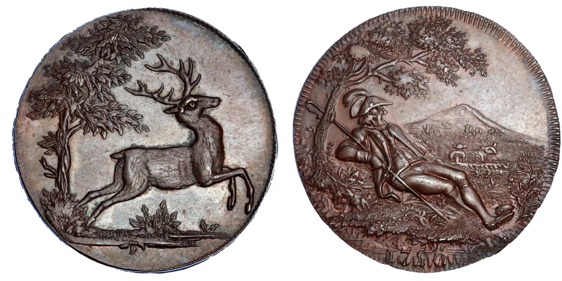 Great Britain, Middlesex, Spence's, copper Halfpenny token, shepherd reclining underneath tree, 1790 in exergue, rev. stag and tree, edge plain (D&H 860), uncirculated, chocolate brown