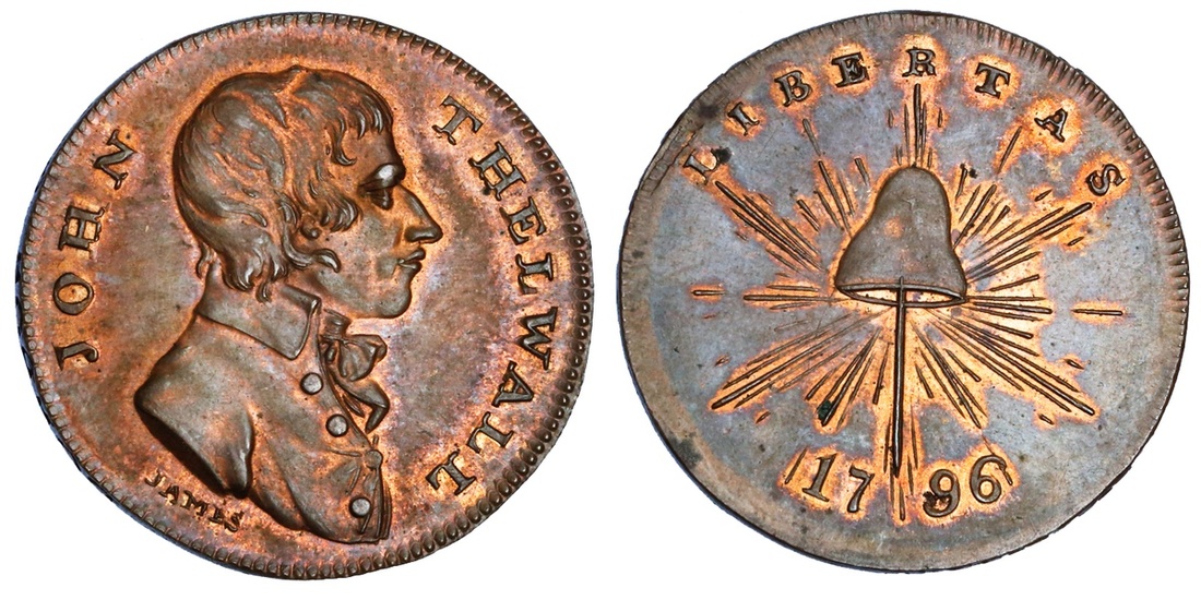 Great Britain, Spence's, copper Halfpenny token, 1796, bust of Thelwall right, john thelwall, james below, rev. cap of liberty radiated upon pole, libertas, date below, edge skidmore holborn london (D&H 865), uncirculated with lustre