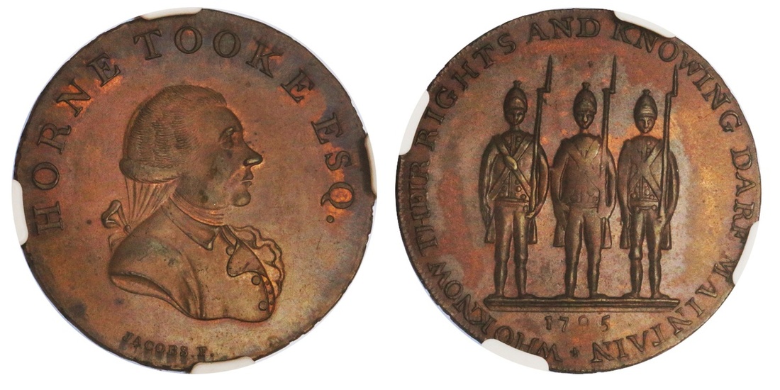 Great Britain, Middlesex, Spence's, copper Halfpenny token, 1795, bust of Tooke left, horne took esq., rev. three armed citizens, who know their rights and knowing dare maintain, edge spence x dealer x in x coins x london x (D&H 875), NGC MS 63 Brown