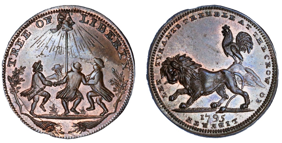 Great Britain, Middlesex, Spence's, copper Halfpenny token, 1795, three men dancing around pole, tree of liberty, rev. lion dismayed at cock crowing, let tyrants tremble at the crow of liberty, edge plain (D&H 889b), uncirculated
