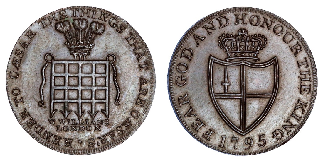 Great Britain, Middlesex, Williams', copper Halfpenny token, 1795, Prince of Wales' crest over portcullis, w williams london below, render to caesar things that are caesar's, rev. crowned arms of London, date below, fear god and honour the king, edge plain (D&H 916), uncirculated, rare