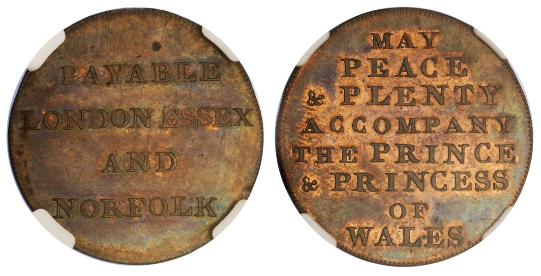 Great Britain, Middlesex, copper Halfpenny token commemorating the marriage of George IV, c1795, may peace & plenty accompany the prince & princess of wales, rev. payable london essex and norfolk, edge plain (D&H 923), NGC MS 62 Red Brown
