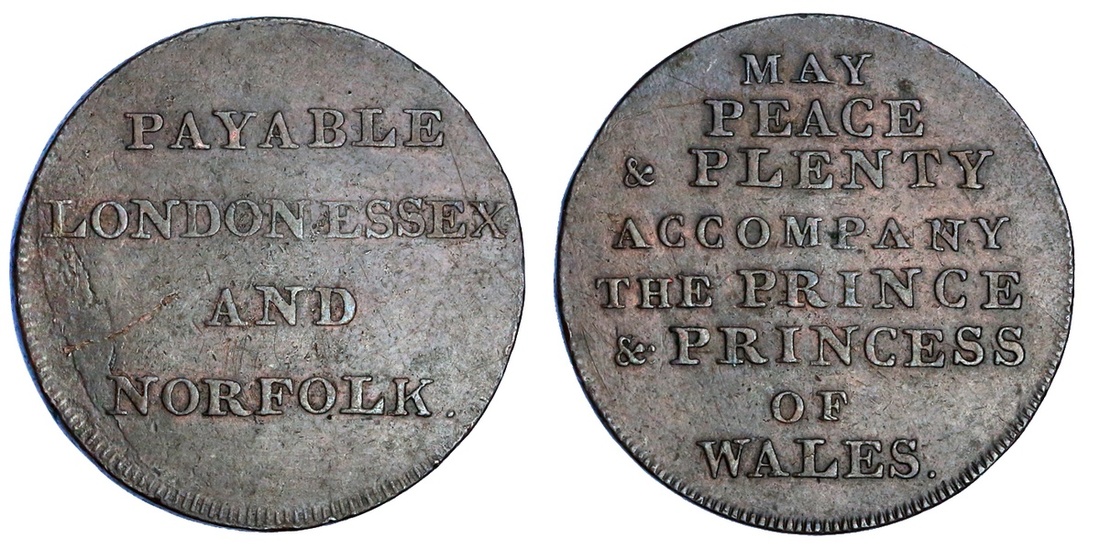 Great Britain, Middlesex, copper Halfpenny token, payable london essex and norfolk, rev. may peace & plenty accompany the prince & princess of wales, edge plain (D&H 924), very fine