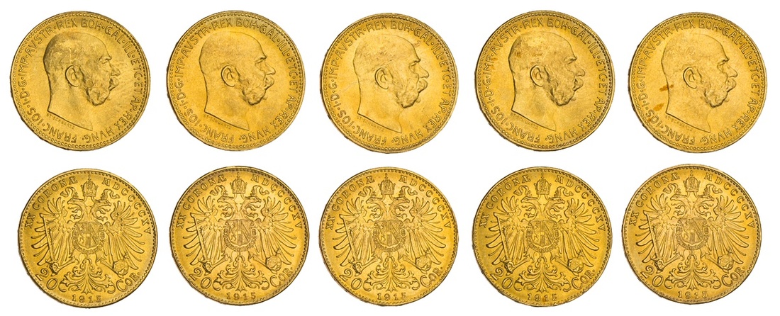 Austria. Franz Josef (1848-1916). A ninth Quintet of Restrike 20 Corona, 1915. Bare head right. Fr.509R, KM 2818. Choice Brilliant Uncirculated. (5)