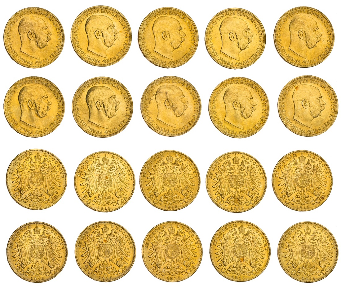 Austria. Franz Josef (1848-1916). Another Half Score of Restrike 20 Corona, 1915. Bare head right. Fr.509R, KM 2818. Brilliant Uncirculated-Choice Brilliant Uncirculated. (10)