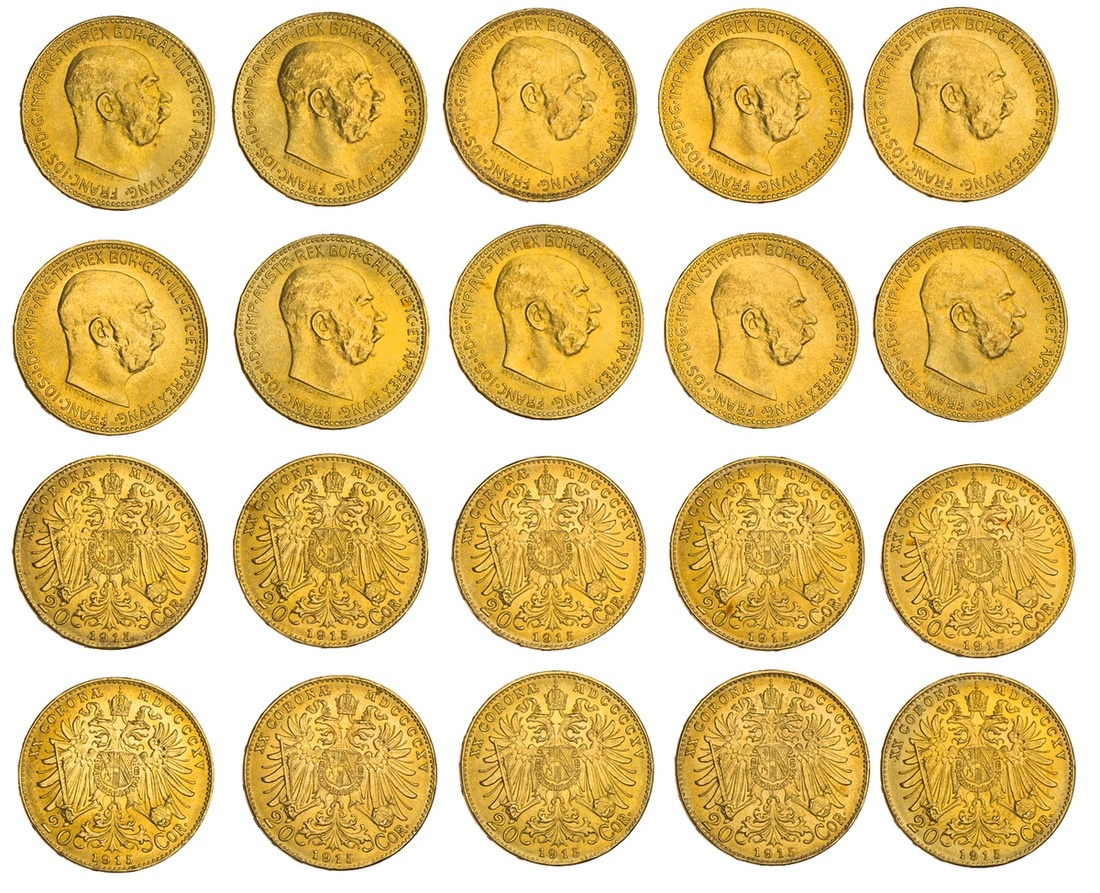 Austria. Franz Josef (1848-1916). A fourth lot of 10 Restrike 20 Corona, 1915. Bare head right. Fr.509R, KM 2818. Brilliant Uncirculated-Choice Brilliant Uncirculated. (10)