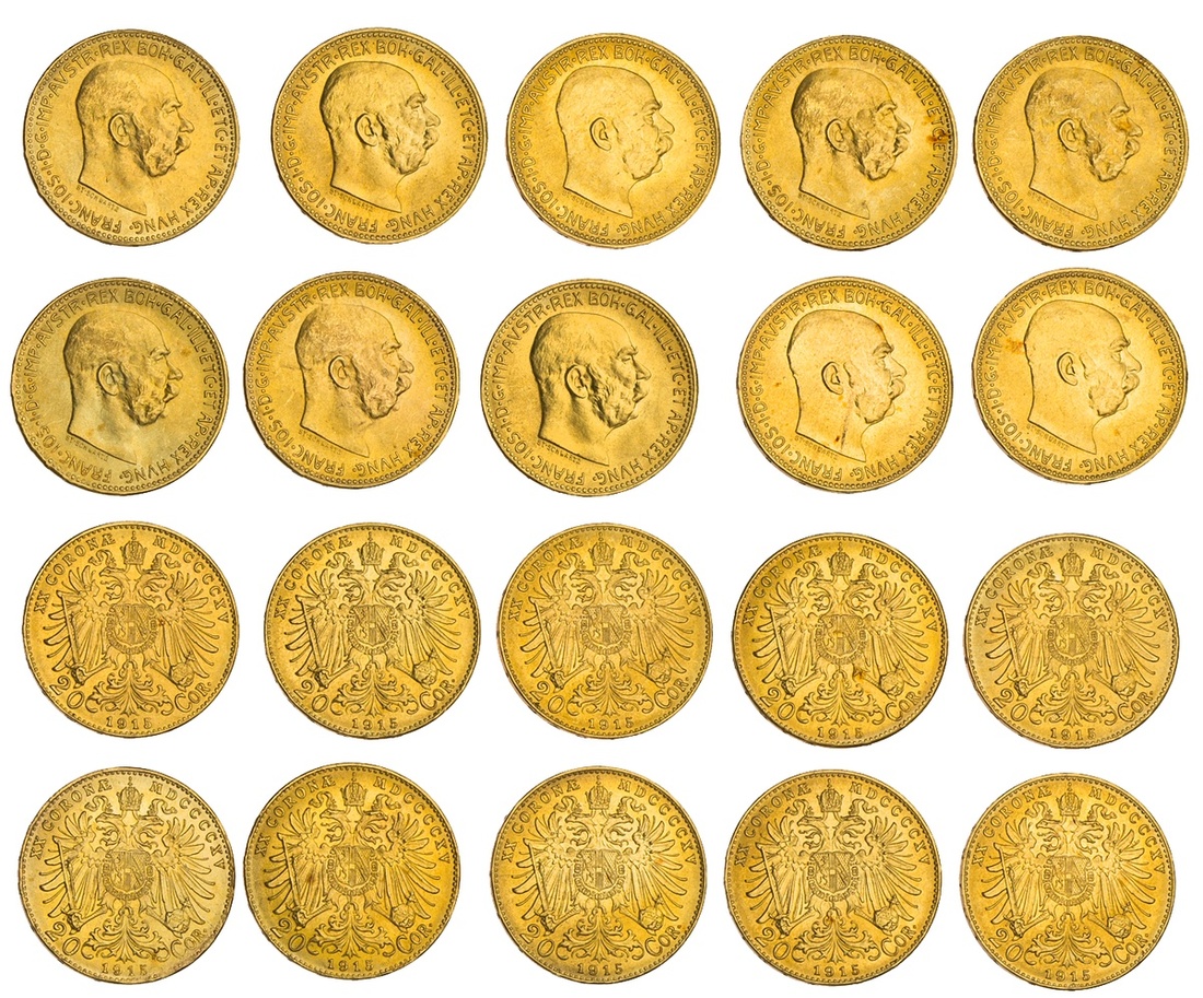 Austria. Franz Josef (1848-1916). A seventh lot of 10 Restrike 20 Corona, 1915. Bare head right. Fr.509R, KM 2818. Brilliant Uncirculated-Choice Brilliant Uncirculated. (10)