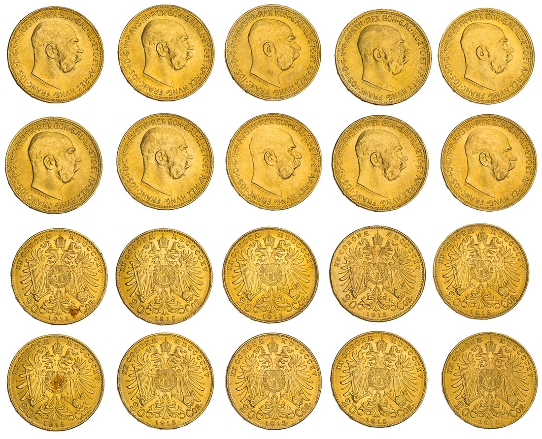 Austria. Franz Josef (1848-1916). A tenth lot of 10 Restrike 20 Corona, 1915. Bare head right. Fr.509R, KM 2818. A few with toning spots. Brilliant Uncirculated-Choice Brilliant Uncirculated. (10)