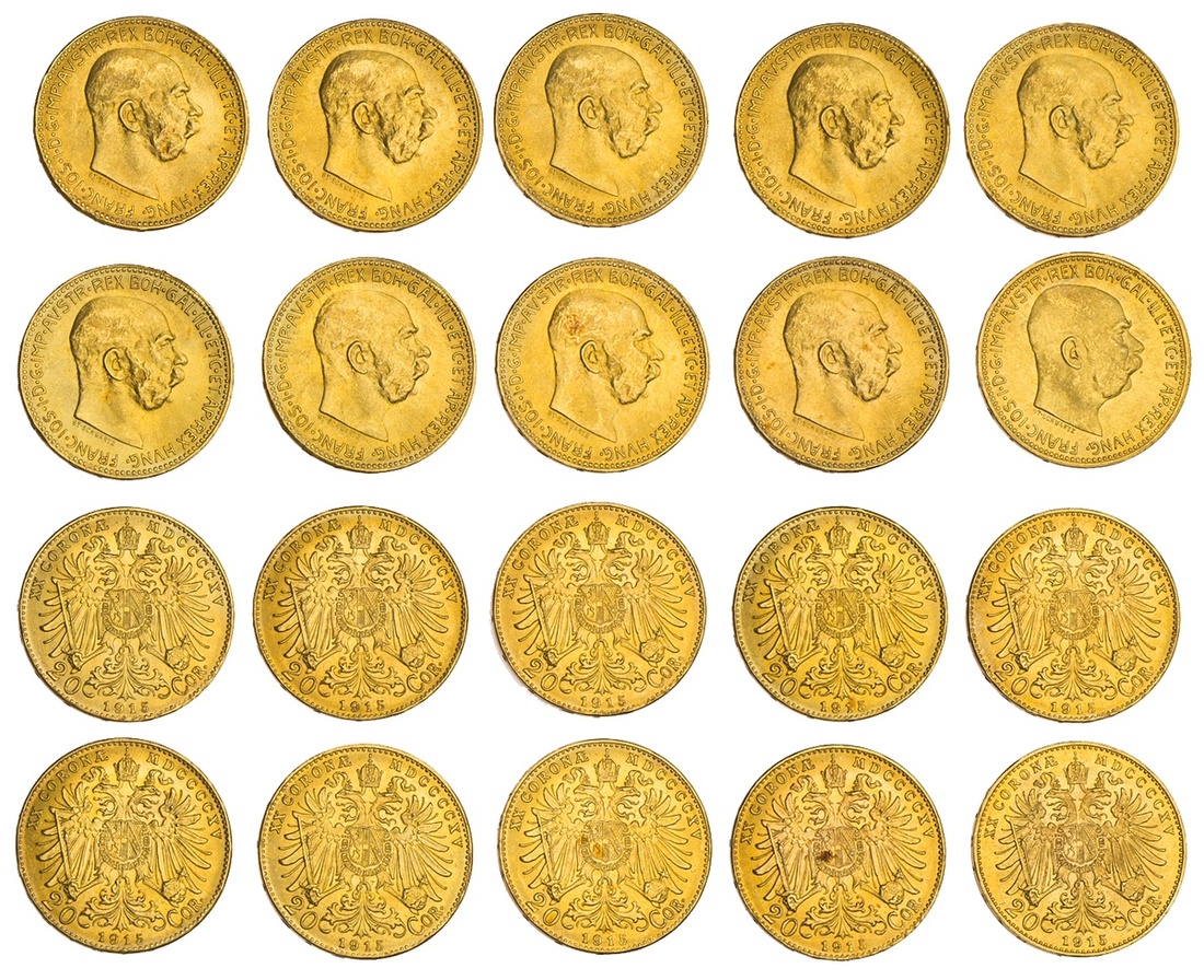 Austria. Franz Josef (1848-1916). A twelfth lot of 10 Restrike 20 Corona, 1915. Bare head right. Fr.509R, KM 2818. A few with toning spots. Brilliant Uncirculated-Choice Brilliant Uncirculated. (10)