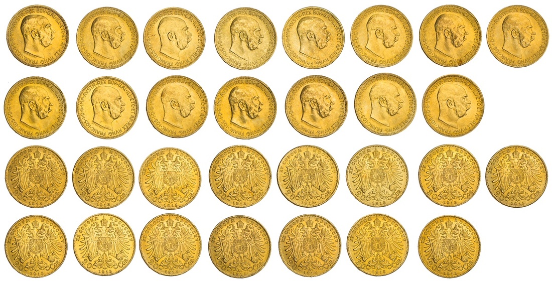 Austria. Franz Josef (1848-1916). Another lot of 15 Restrike 20 Corona, 1915. Bare head right. Fr.509R, KM 2818. A few with toning spots. Brilliant Uncirculated-Choice Brilliant Uncirculated. (15)