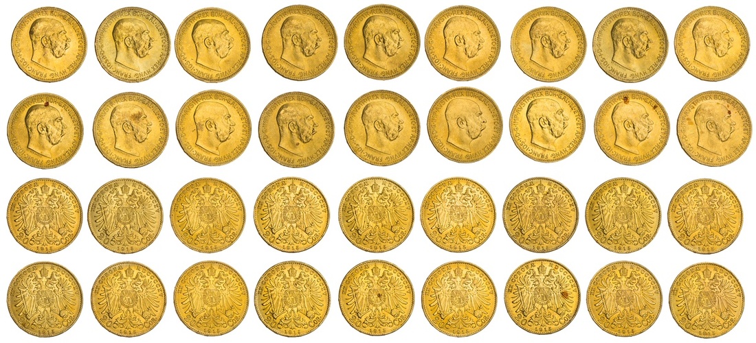 Austria. Franz Josef (1848-1916). A lot of 18 Restrike 20 Corona, 1915. Bare head right. Fr.509R, KM 2818. A few with toning spots. Brilliant Uncirculated-Choice Brilliant Uncirculated. (18)