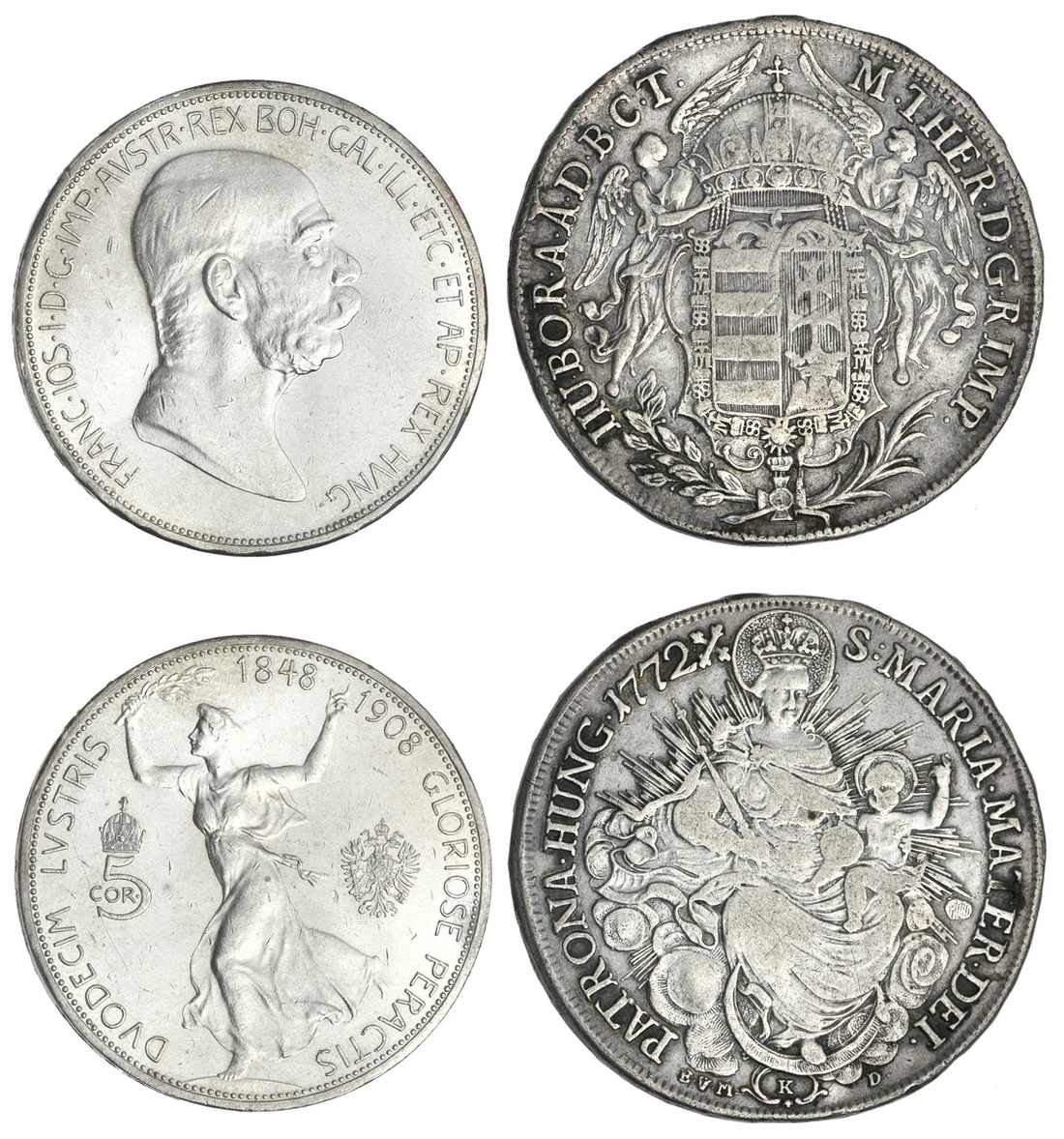 Austria. Franz Josef (1848-1916). 5 Corona, 1908. 60th Anniversary of Reign. Bare head right, rev. Fame running left. KM 2809. Brilliant Uncirculated; also, Hungary. Maria Theresa. Taler, 1772 EVM-K-D. Angel-supported Arms / Madonna and Child. Traces of mount removal at 12:00. Very Fine. (2)