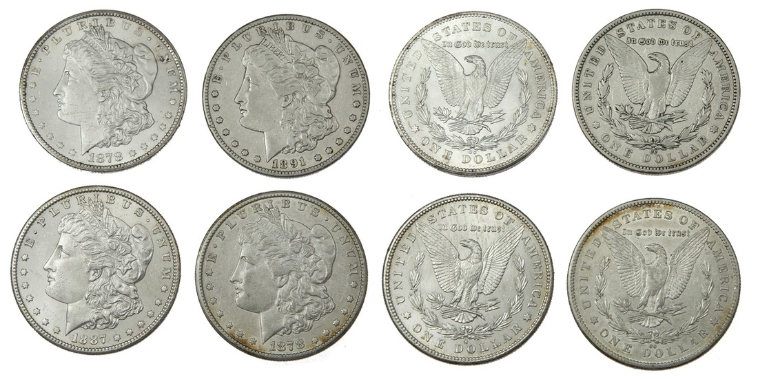 Better Date Morgan Dollar Selection. 1878-CC EF; 1878-CC Brilliant Uncirculated, close to Choice; 1887-S Choice BU; 1891-CC VF.