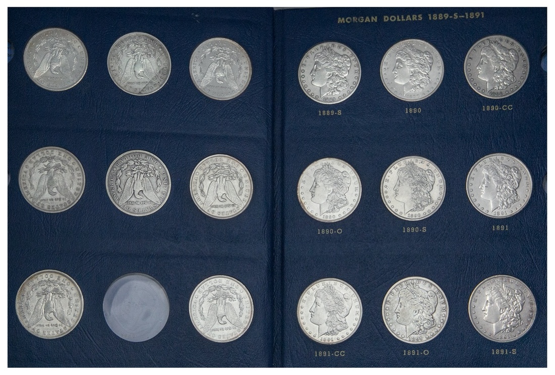 Morgan Dollars, 1887 through 1896. In a blue Whitman album. No 1889-CC, 1893-S, 1894 or 1895. 1887 BU; 1887-O VF-EF; 1887-S BU; 1888 BU; 1888-O Fine; 1888-S VF; 1889 BU; 1889-O EF; 1889-S VF; 1890 BU; 1890-CC F-VF; 1890-O Choice BU; 1890-S AU; 1891 AU; 1891-CC AU; 1891-O VF; 1891-S EF; 1892 EF; 1892-CC VG-Fine; 1892-O VF; 1892-S Fine; 1893 Fine; 1893-CC Abt. Fine; 1893-O VF; 1894-O EF; 1894-S Fine; 1885 Gem BU (in the place for the 1895 Proof); 1896-O Fine; 1896-S Fine.