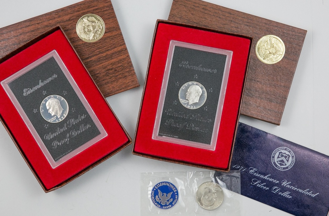 U. S. Silver Dollar Assortment. 1882 BU; 1882-CC BU in GSA packaging with papers; 1882-O Fine; 1888-O VF; 1889-O F-VF(3); 1890-O VG; 1891 Fine, stains; 1891-O cull1891-O Fine, stains; 1921 Morgan AU; 1921-D Morgan AU, scratches, and a 1922 Peace Dollar AU; 1971 Blue Ike(3); 1971 Brown Ike(4); 1972 Brown Ike(2).